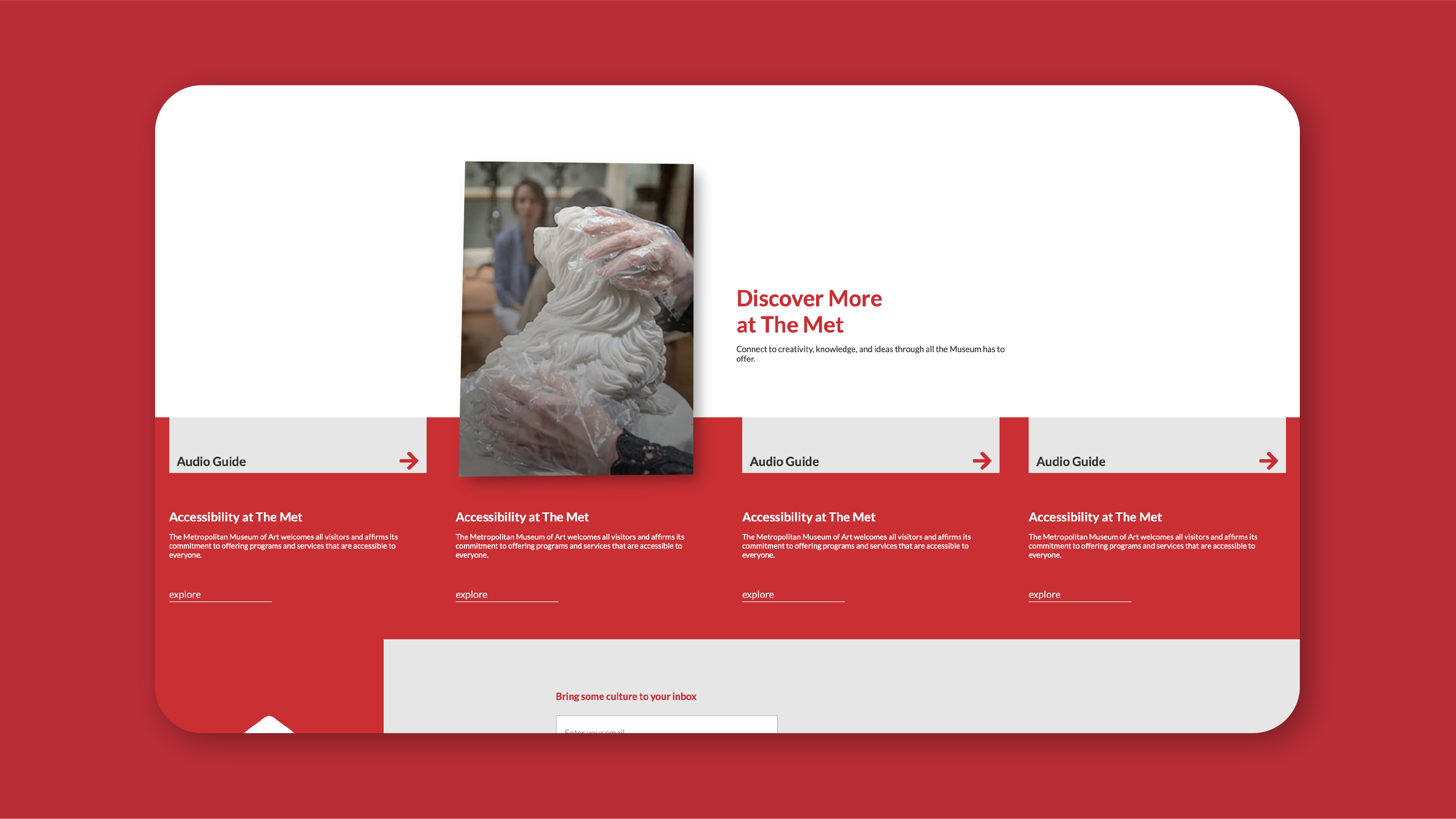 While researching how the big names in art gallery businesses are doing with their website, I came across The Met homepage and decided to make a redesign to explore new approaches. There are 3 key changes I made in this redesign. First, the UI system is optimized to bring out the brand identity. Second, the structure of the content is adjusted into pillars that make all the info on the page well-organized and easier to access. And the final change is the site's interactions which make the site more joyful to interact with.